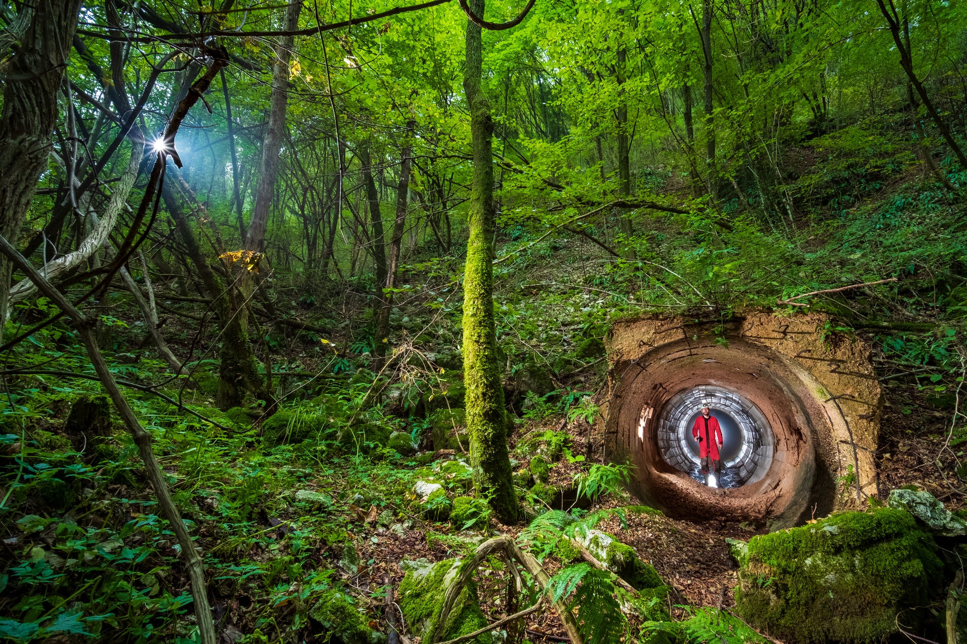 @realoutex 💬 Magical shot. This image stands out for its narrative strength and contrast between the lush forest and the circular tunnel. The centered subject in red guides the eye and reinforces a sense of transition within an immersive atmosphere.