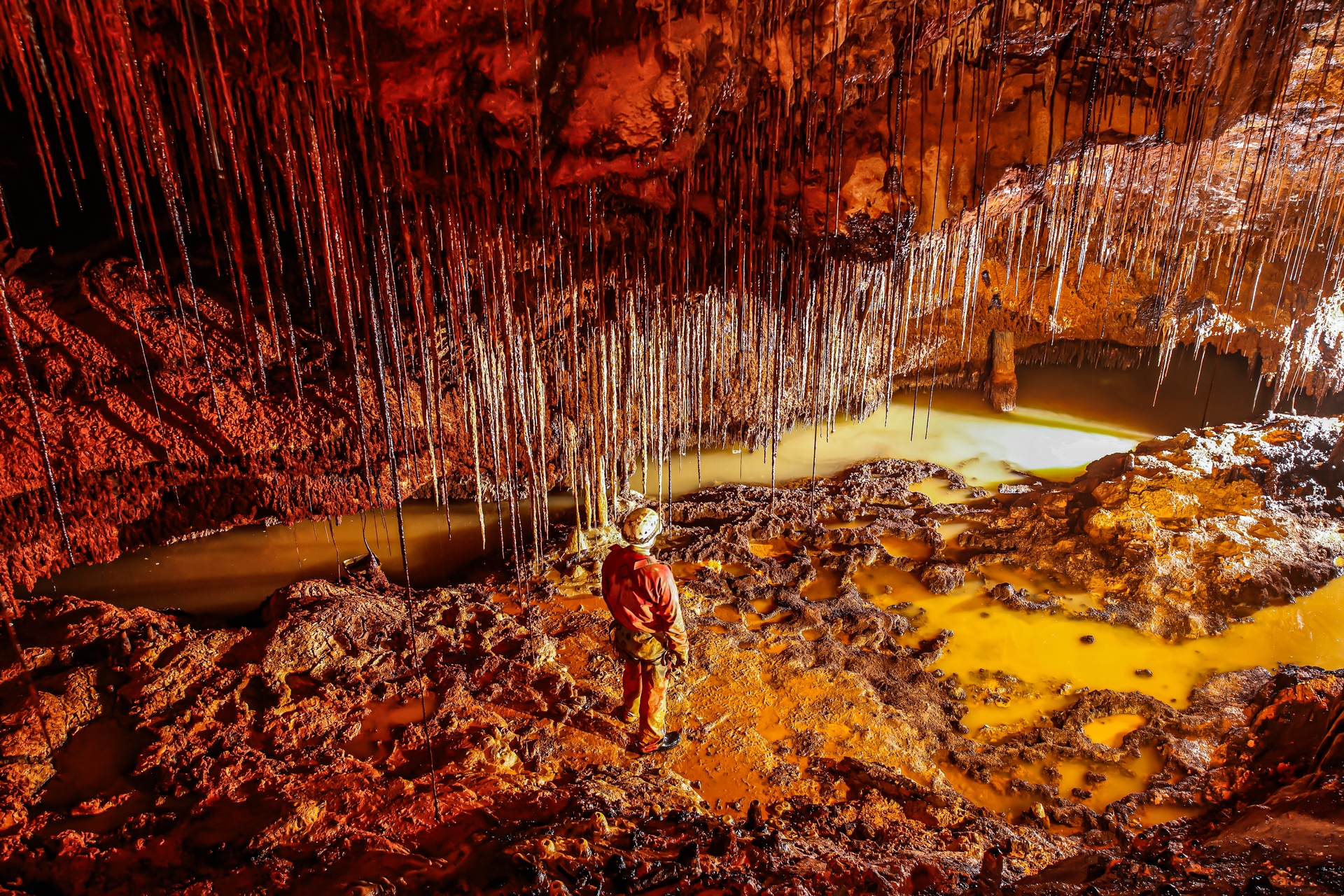 💬 "Another magical shot. This image is powerful and immersive, driven by atmosphere, color, and a strong sense of human scale. The photograph immediately envelops the viewer in a dense, almost otherworldly environment. The cave interior is rendered in deep reds, ochres, and molten yellows, creating a visceral sense of heat, weight, and geological intensity. The long mineral formations hanging from the ceiling act like a curtain, adding both texture and a subtle sense of tension as they descend toward the ground. The human figure is used with restraint and intelligence. Positioned slightly off-center and facing into the scene, the subject becomes a proxy for the viewer—inviting contemplation rather than action. Light helps define the interplay between the illuminated pools of water and the darker, saturated rock surfaces creates a layered, cinematic depth. Reflections in the water introduce softer tones that counterbalance the heavy textures of the stone, preventing the frame from becoming visually oppressive. The balance of vertical and horizontal elements gives the frame structure while preserving its organic complexity.
